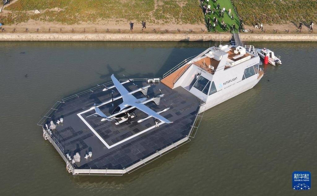 2025年11月22日,一架电动垂直起降飞行器停在全新亮相的零碳水上机场(无人机照片)。新华社记者 方喆 摄